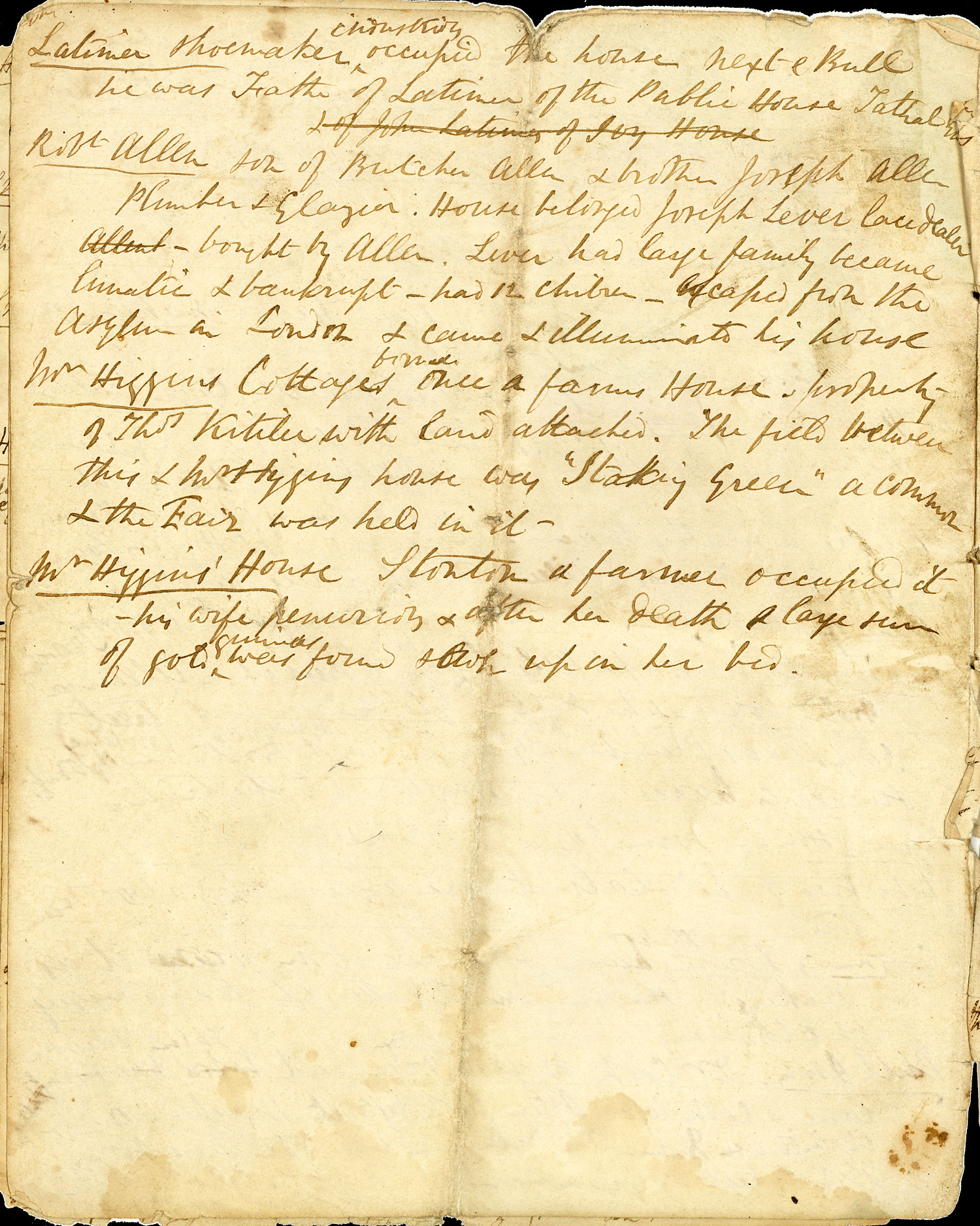 Mr HIGGIN'S HOUSE - Stanton a farmer occupied it - his wife penurious and after her death a large sum of gold guineas was found sewn up in her bed. |
