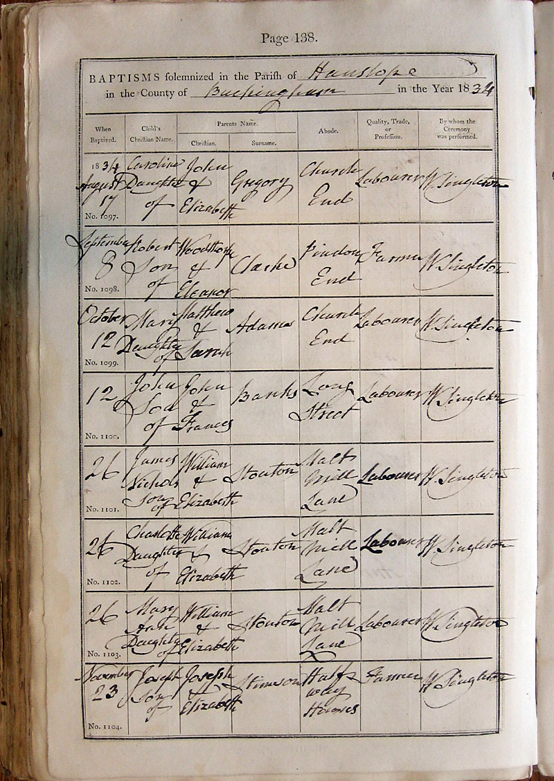 Below is a transcription and image of page 138 of the Baptism register for 1813-1845 of St. James The Great, Hanslope
