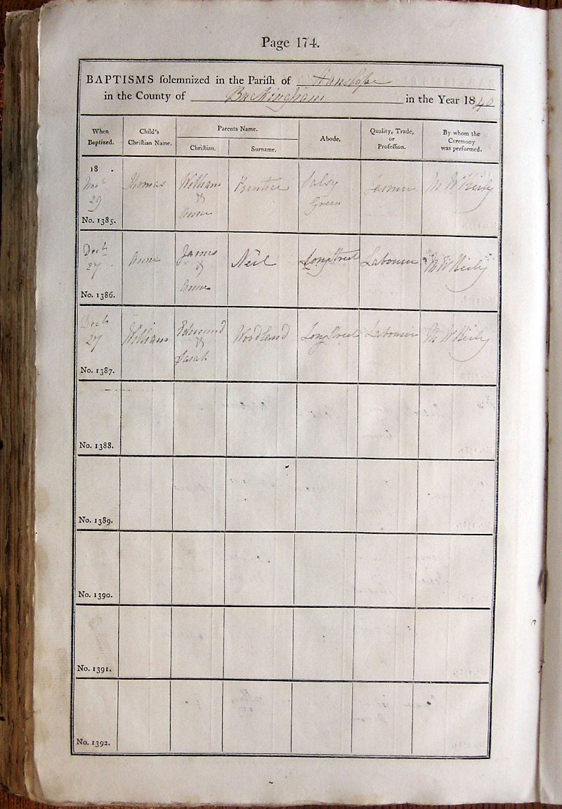 Below is a transcription and image of page 174 of the Baptism register for 1813-1845 of St. James The Great, Hanslope