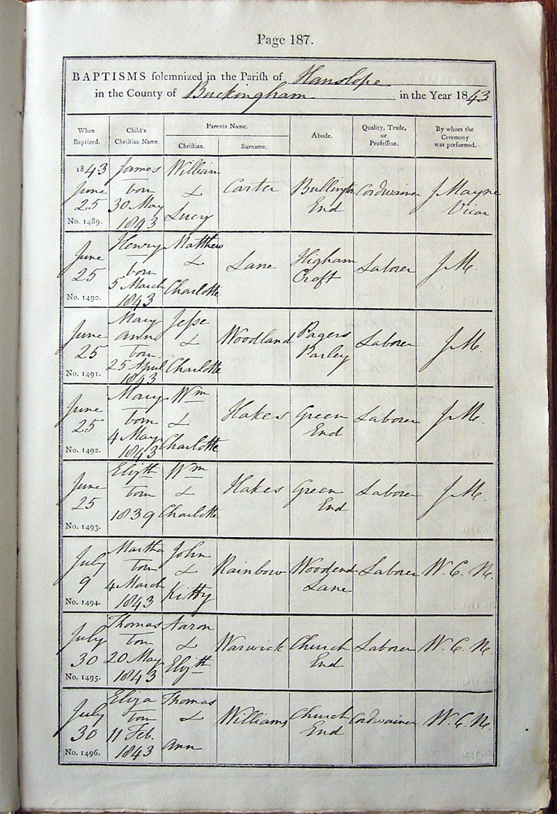 Below is a transcription and image of page 187 of the Baptism register for 1813-1845 of St. James The Great, Hanslope |