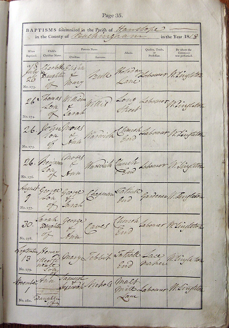 Below is a transcription and image of page 35 of the Baptism register for 1813-1845 of St. James The Great, Hanslope