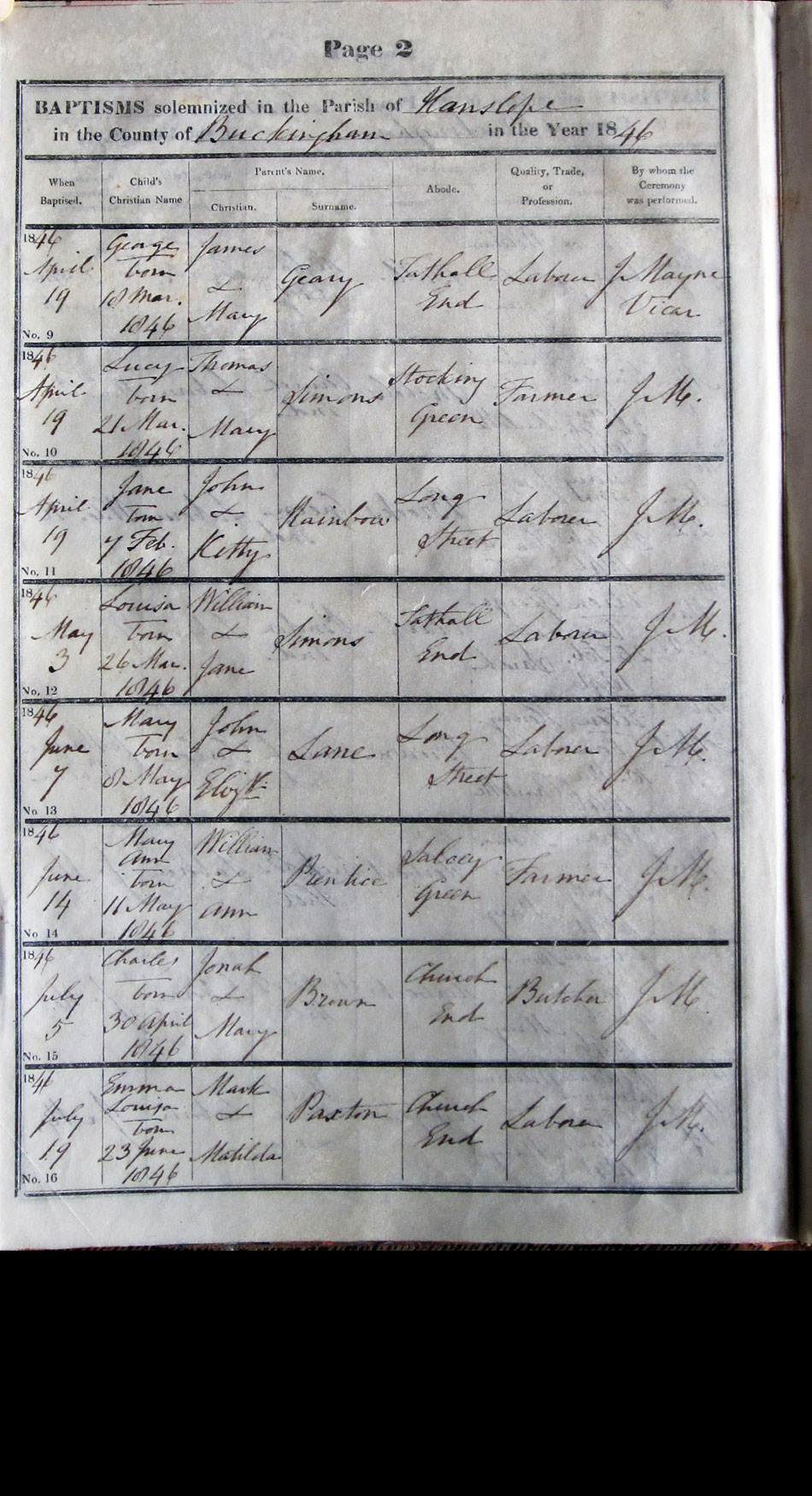 Below is a transcription and image of page 2 of the Baptism register for 1846-1863 of St. James The Great, Hanslope |