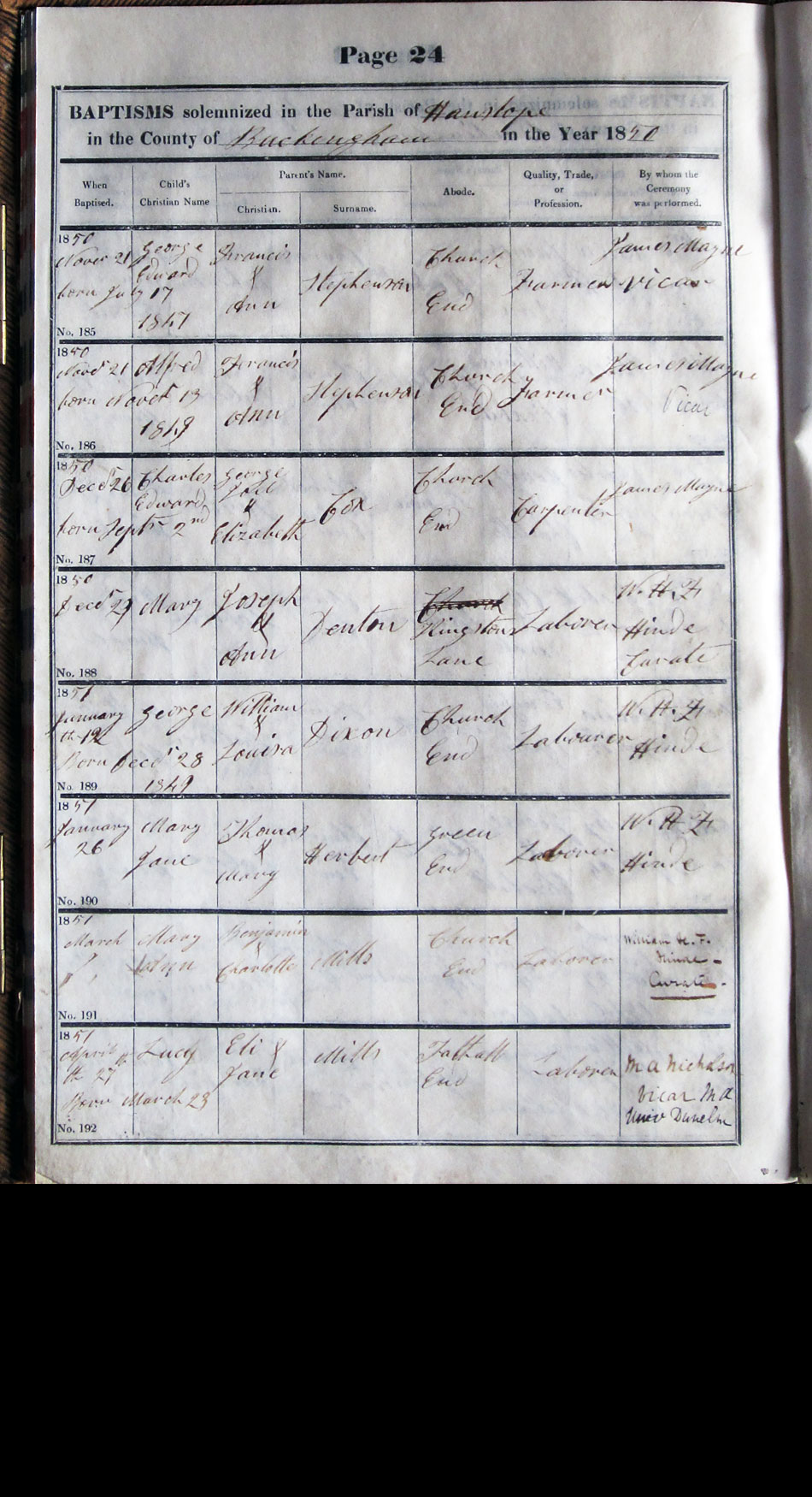 Below is a transcription and image of page 24 of the Baptism register for 1846-1863 of St. James The Great, Hanslope |