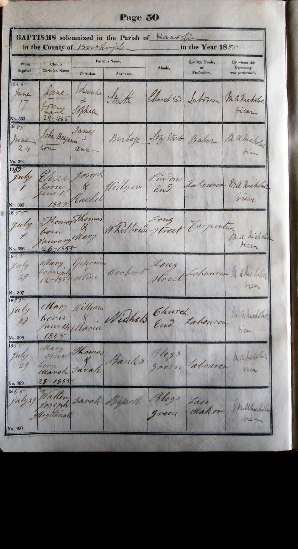 Below is a transcription and image of page 50 of the Baptism register for 1846-1863 of St. James The Great, Hanslope |