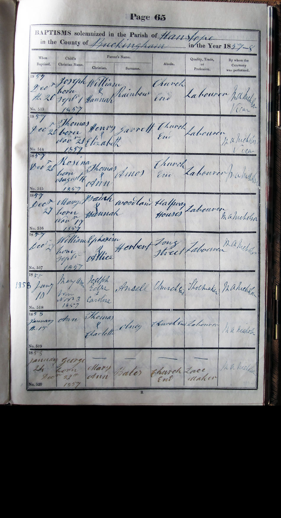Below is a transcription and image of page 65 of the Baptism register for 1846-1863 of St. James The Great, Hanslope |