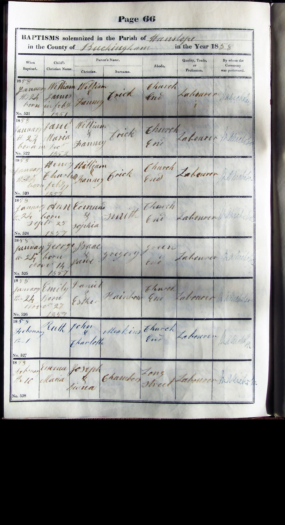 Below is a transcription and image of page 66 of the Baptism register for 1846-1863 of St. James The Great, Hanslope |