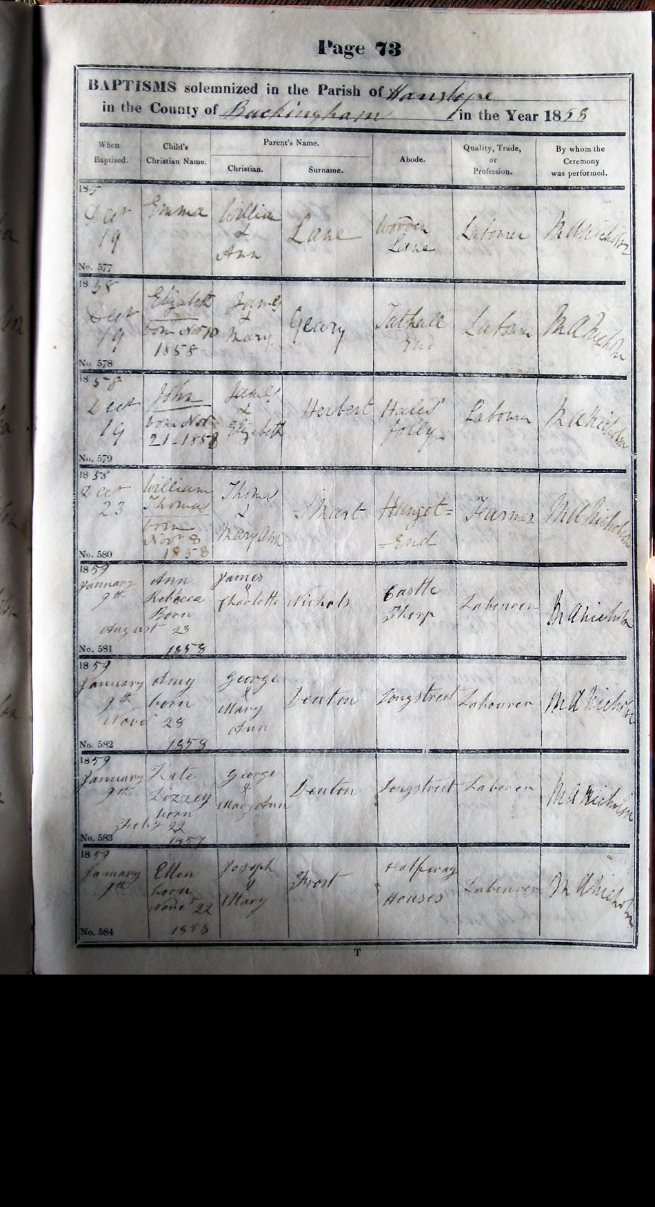 Below is a transcription and image of page 73 of the Baptism register for 1846-1863 of St. James The Great, Hanslope |