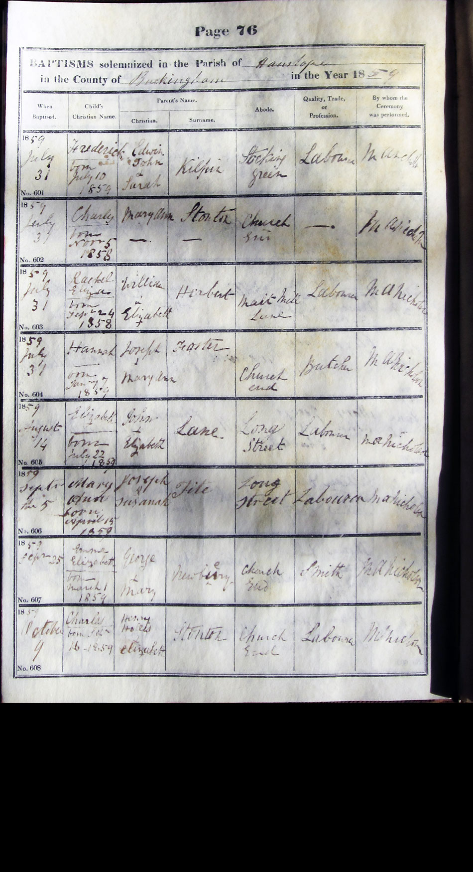 Below is a transcription and image of page 76 of the Baptism register for 1846-1863 of St. James The Great, Hanslope