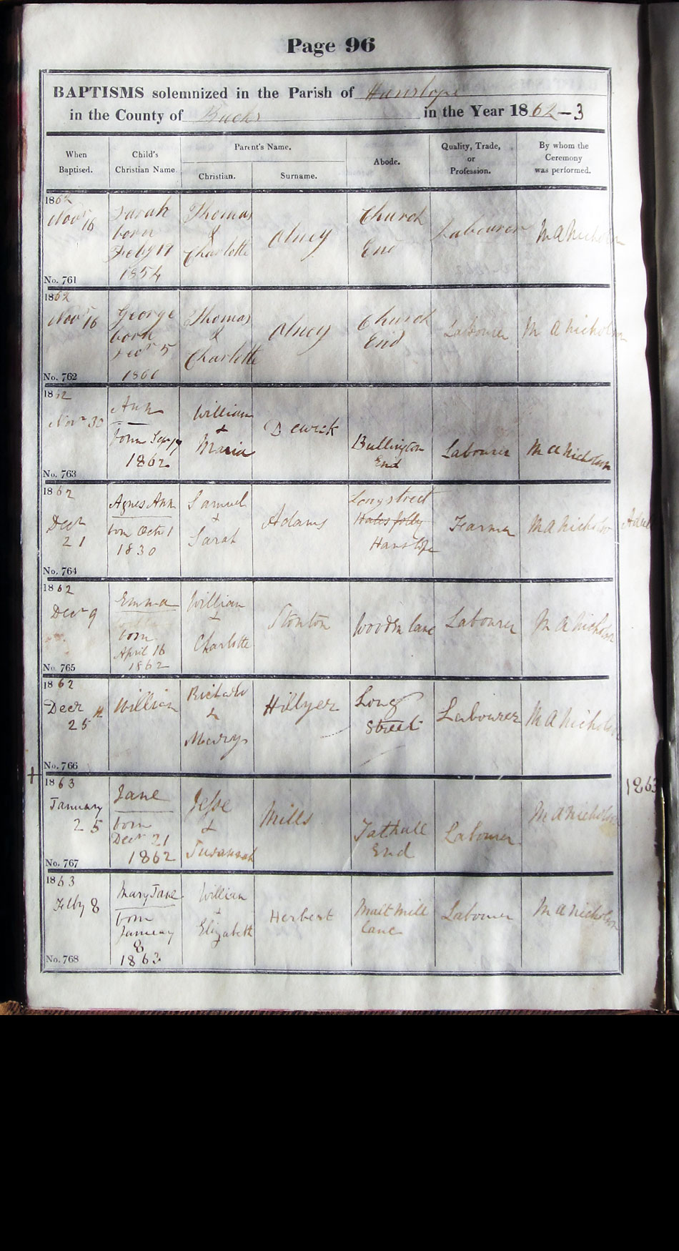 Below is a transcription and image of page 96 of the Baptism register for 1846-1863 of St. James The Great, Hanslope