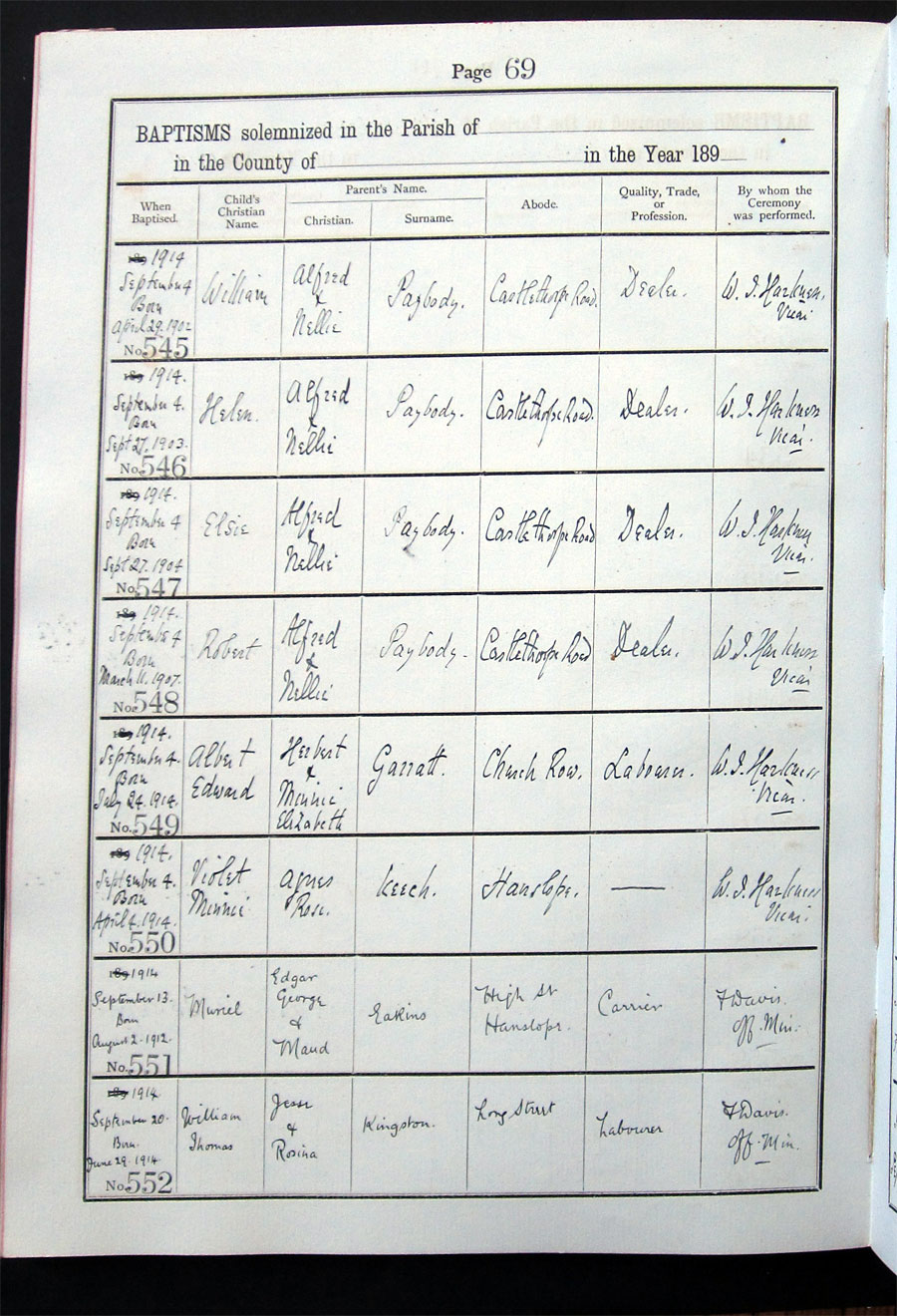Below is a transcription and image of page 69 of the Baptism register for 1893-1928 of St. James The Great, Hanslope |