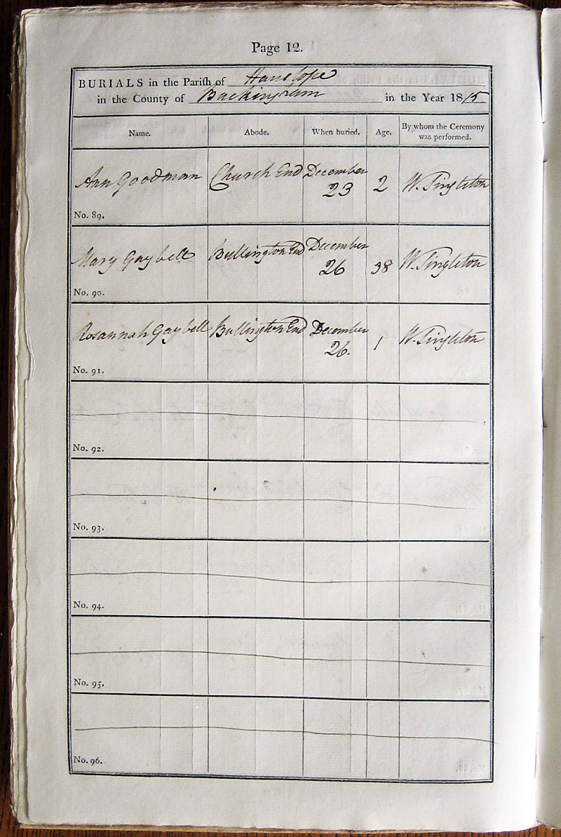 Below is a transcription and image of page 12 of the Burial register for 1813-1852 of St. James The Great, Hanslope |