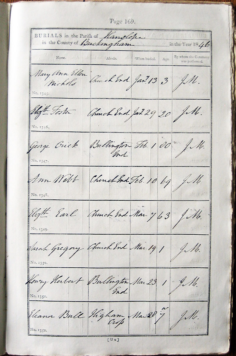 Below is a transcription and image of page 169 of the Burial register for 1813-1852 of St. James The Great, Hanslope |