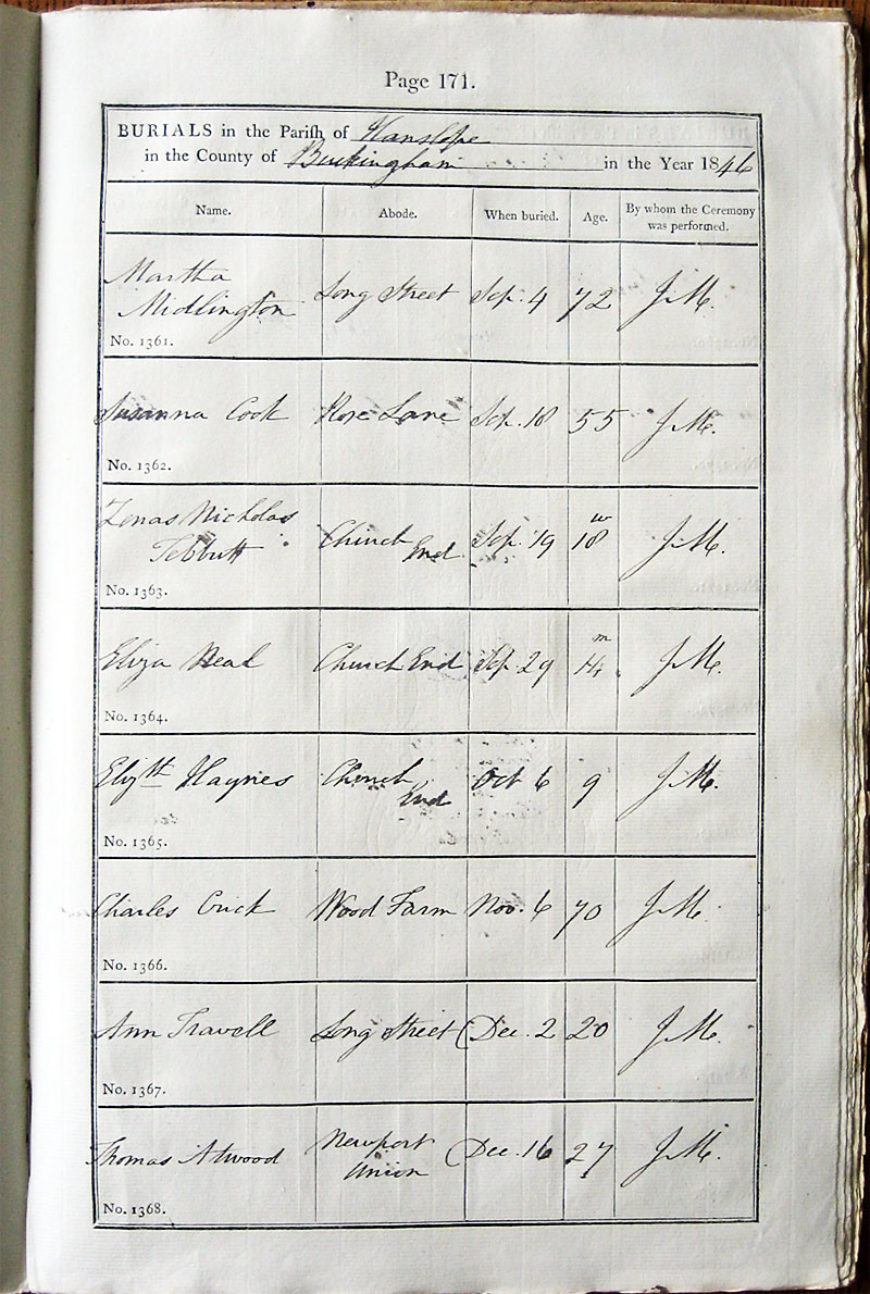 Below is a transcription and image of page 171 of the Burial register for 1813-1852 of St. James The Great, Hanslope |