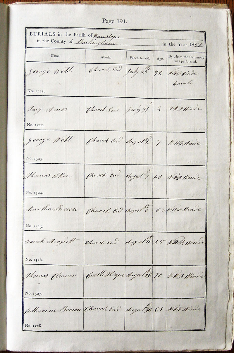 Below is a transcription and image of page 191 of the Burial register for 1813-1852 of St. James The Great, Hanslope |