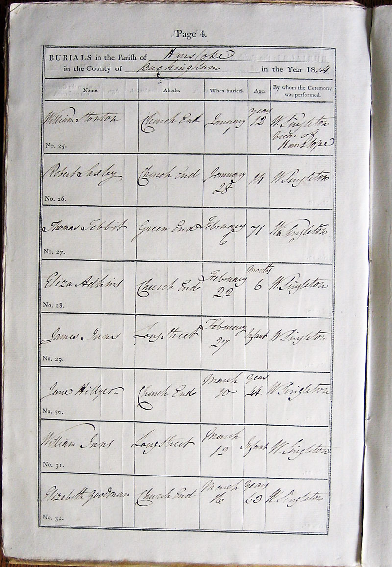 Below is a transcription and image of page 4 of the Burial register for 1813-1852 of St. James The Great, Hanslope |