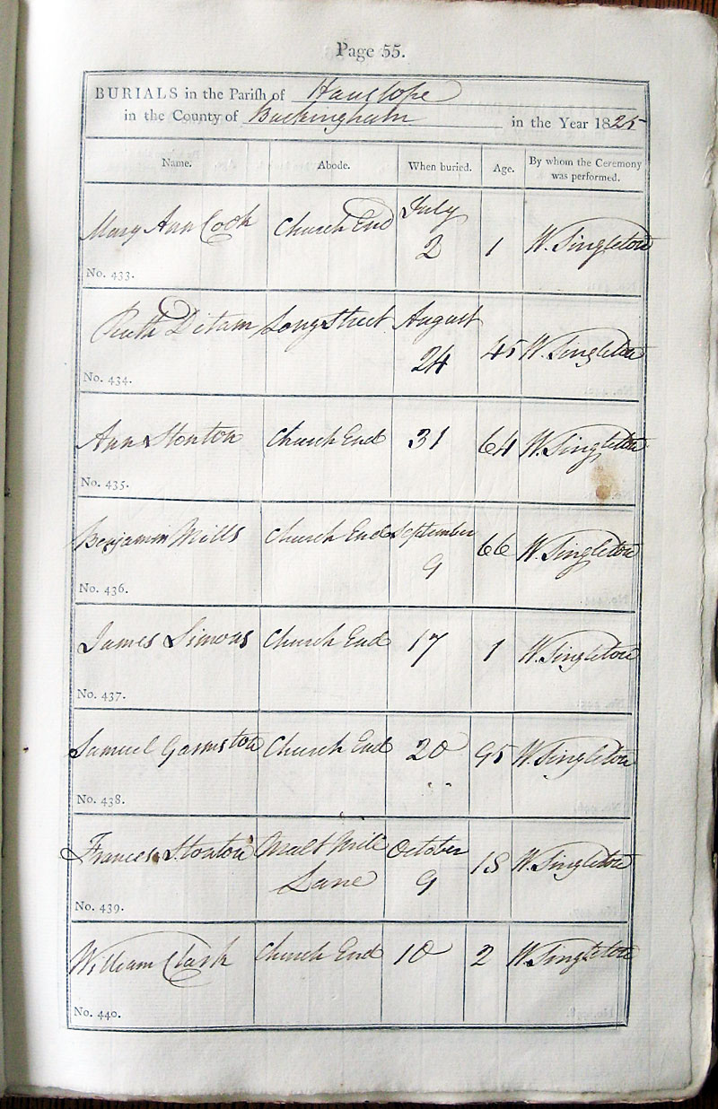 Below is a transcription and image of page 55 of the Burial register for 1813-1852 of St. James The Great, Hanslope |