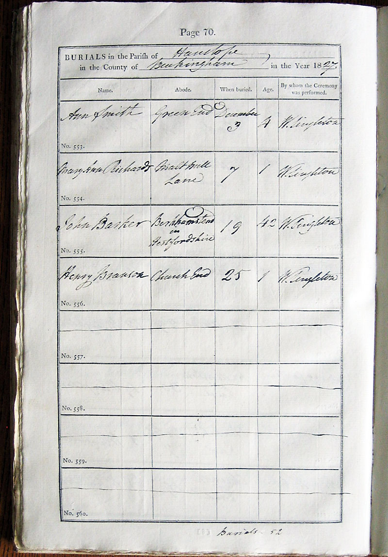 Below is a transcription and image of page 70 of the Burial register for 1813-1852 of St. James The Great, Hanslope |