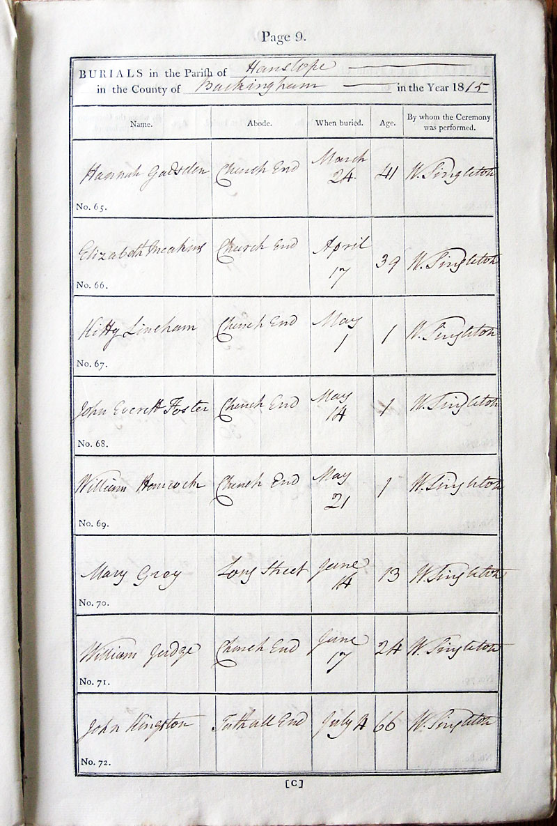 Below is a transcription and image of page 9 of the Burial register for 1813-1852 of St. James The Great, Hanslope |