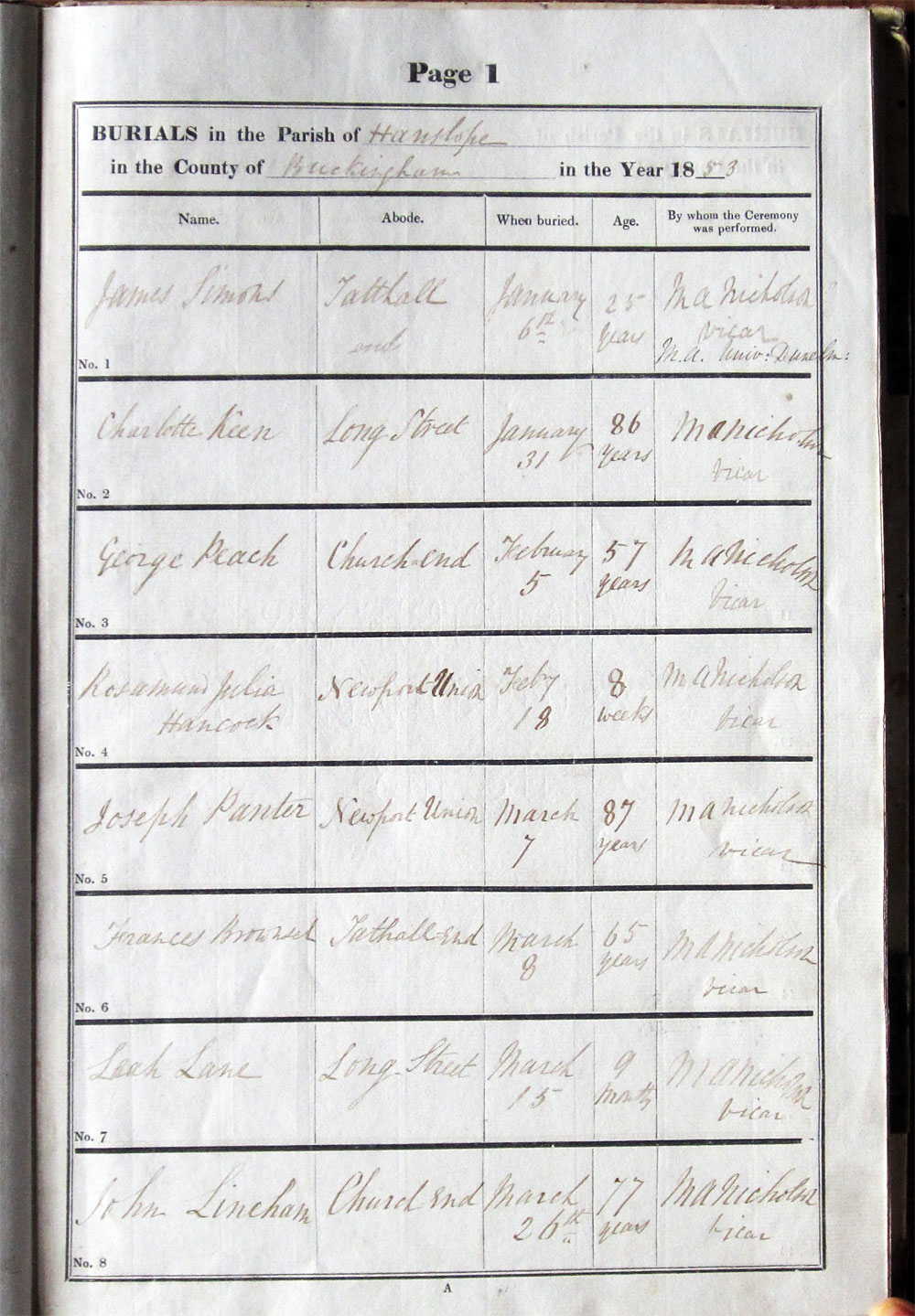 Below is a transcription and image of page 1 of the Burial register for 1853-1878 of St. James The Great, Hanslope |
