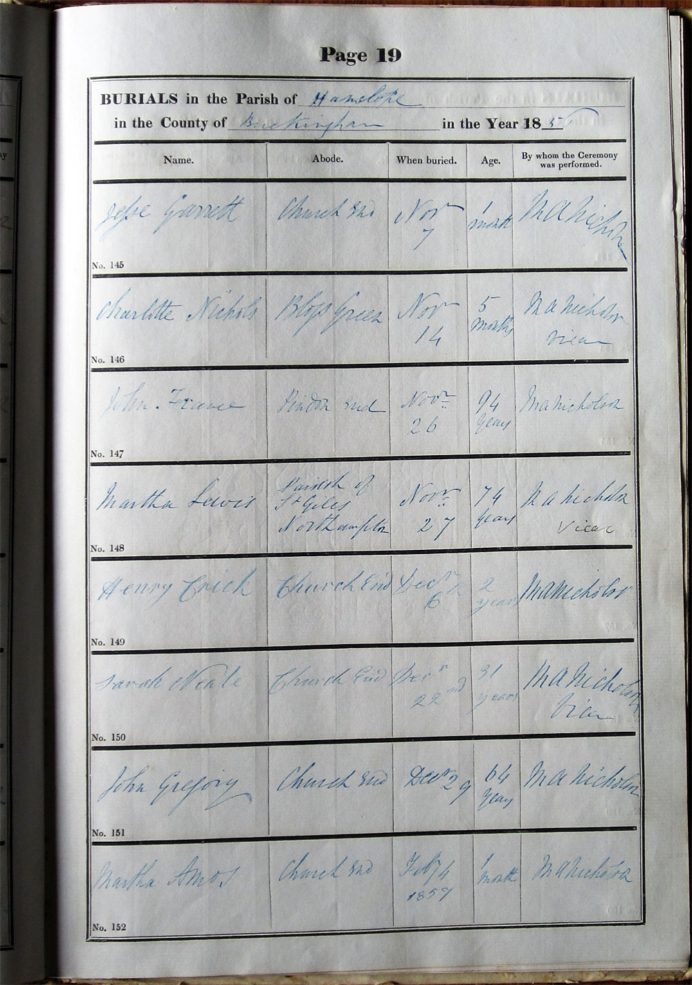 Below is a transcription and image of page 19 of the Burial register for 1853-1878 of St. James The Great, Hanslope |