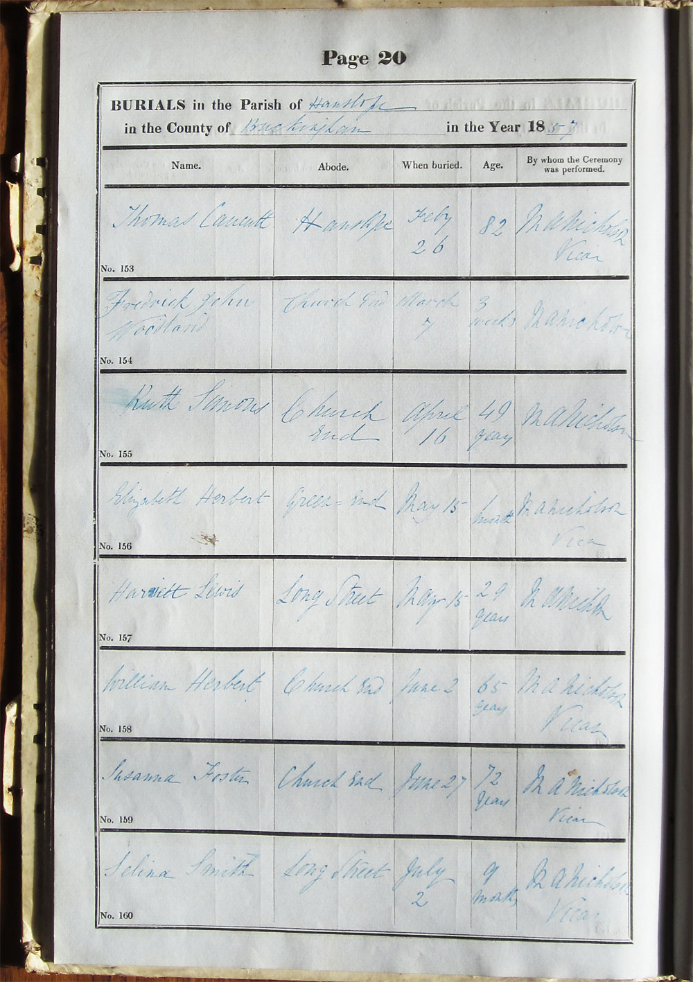 Below is a transcription and image of page 20 of the Burial register for 1853-1878 of St. James The Great, Hanslope |