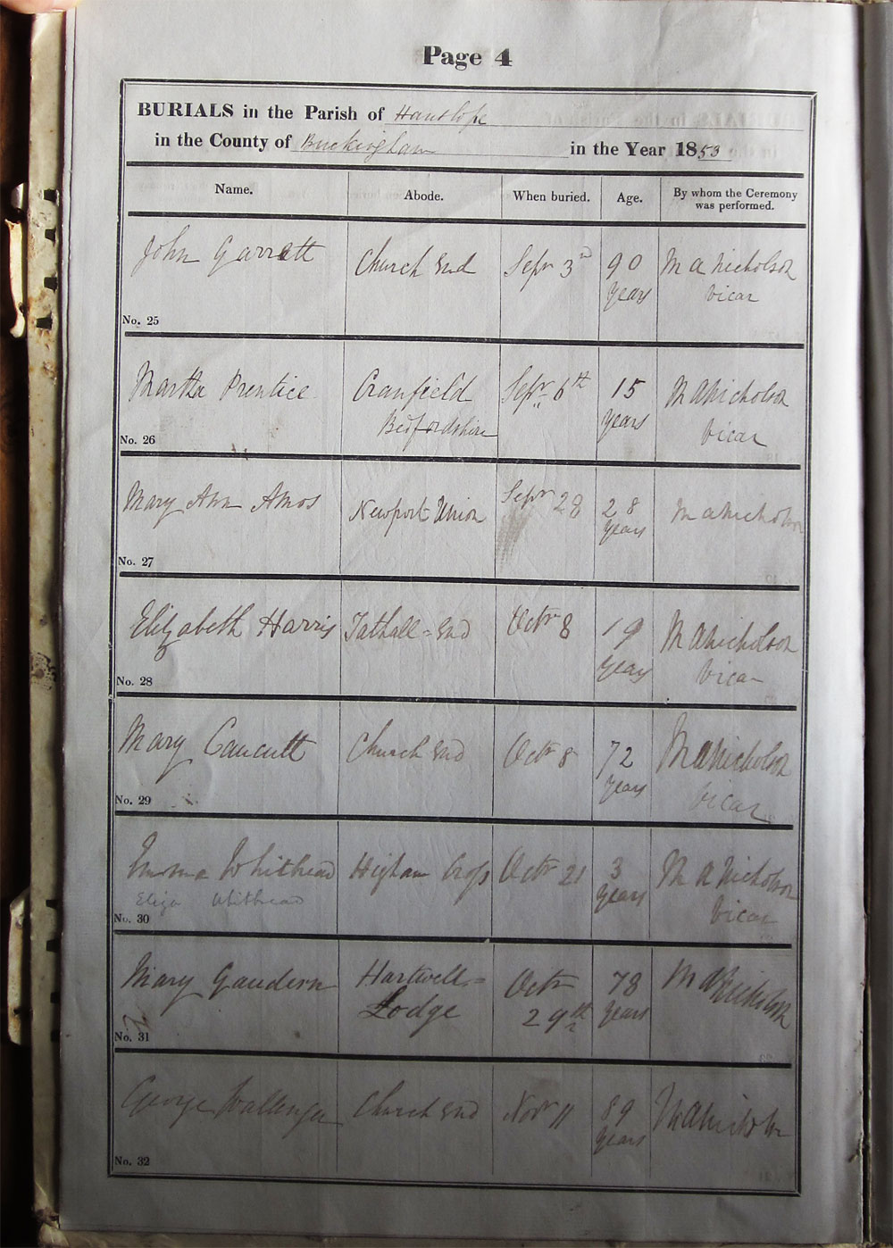 Below is a transcription and image of page 4 of the Burial register for 1853-1878 of St. James The Great, Hanslope |