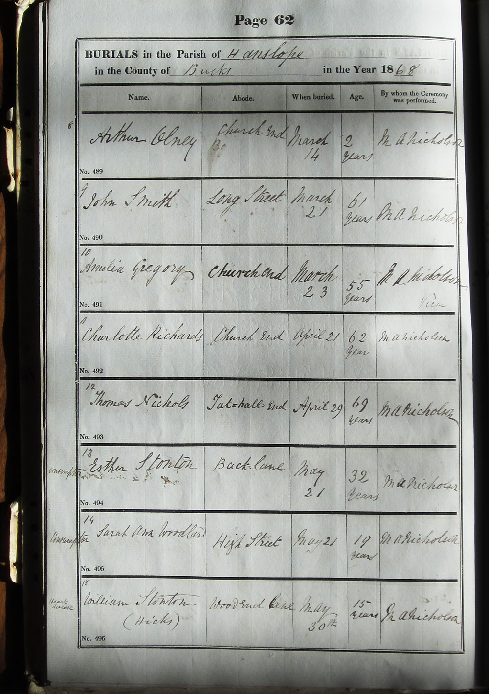 Below is a transcription and image of page 62 of the Burial register for 1853-1878 of St. James The Great, Hanslope |