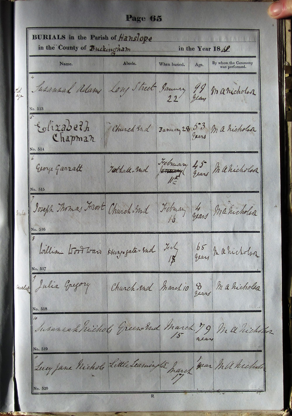 Below is a transcription and image of page 65 of the Burial register for 1853-1878 of St. James The Great, Hanslope |