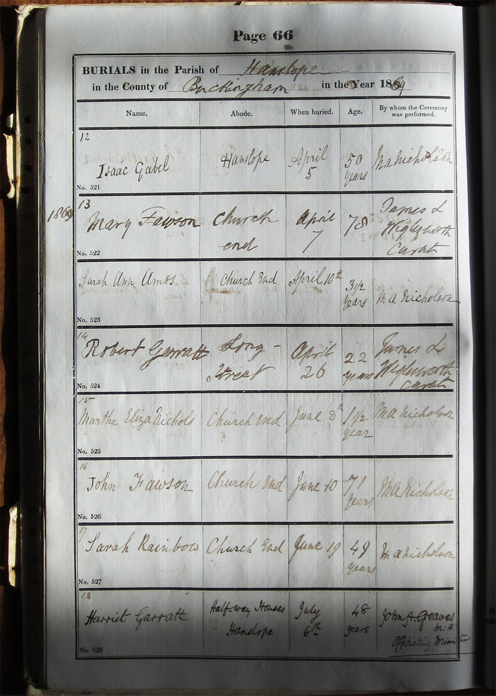 Below is a transcription and image of page 66 of the Burial register for 1853-1878 of St. James The Great, Hanslope |