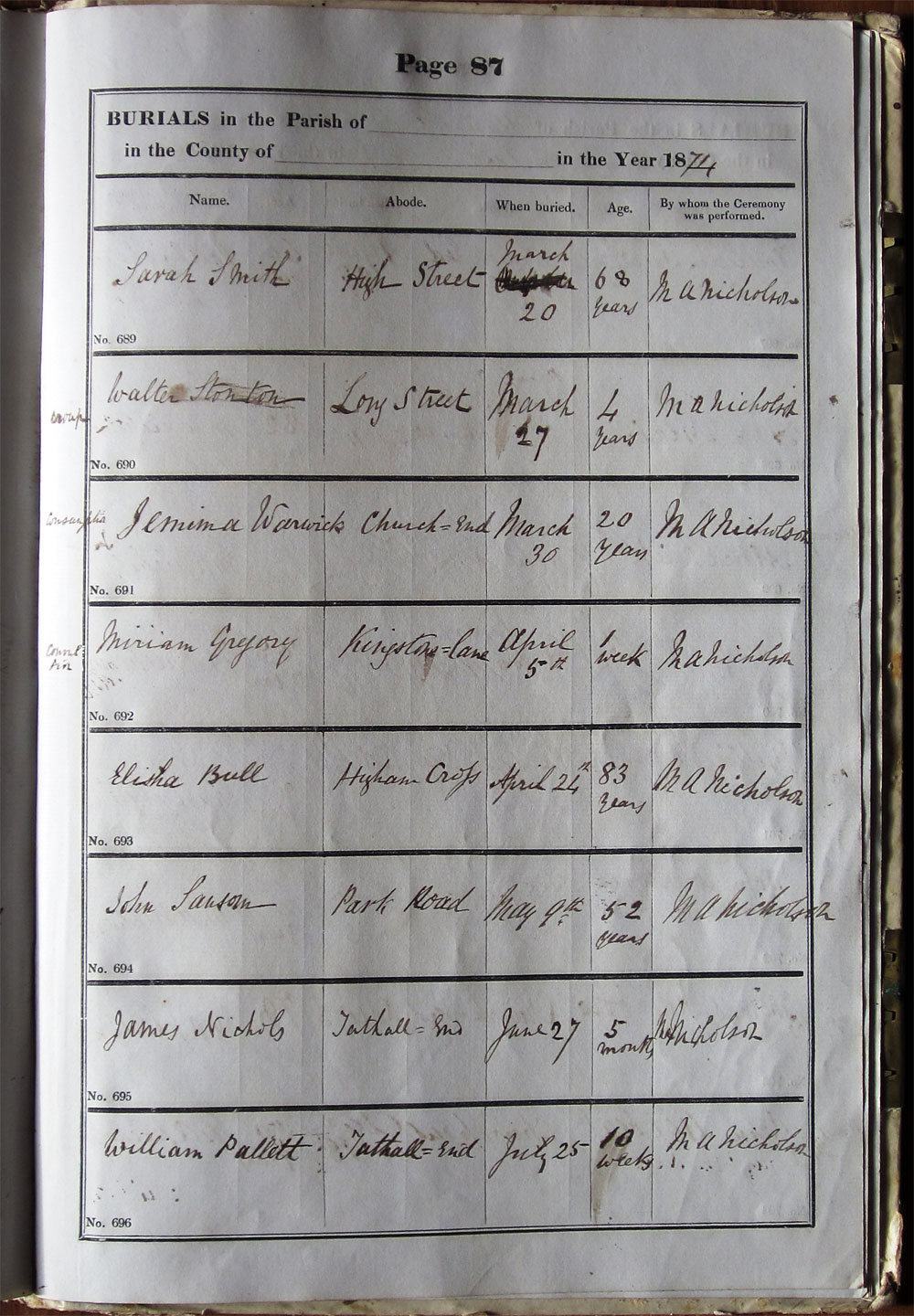 Below is a transcription and image of page 87 of the Burial register for 1853-1878 of St. James The Great, Hanslope |