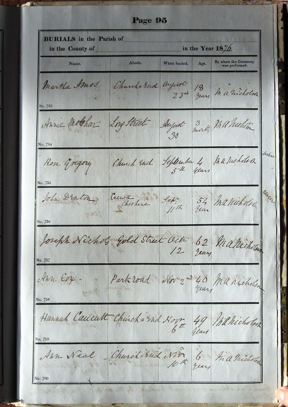 Below is a transcription and image of page 95 of the Burial register for 1853-1878 of St. James The Great, Hanslope