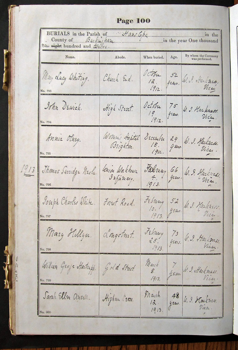 Below is a transcription and image of page 100 of the Burial register for 1878-1963 of St. James The Great, Hanslope |