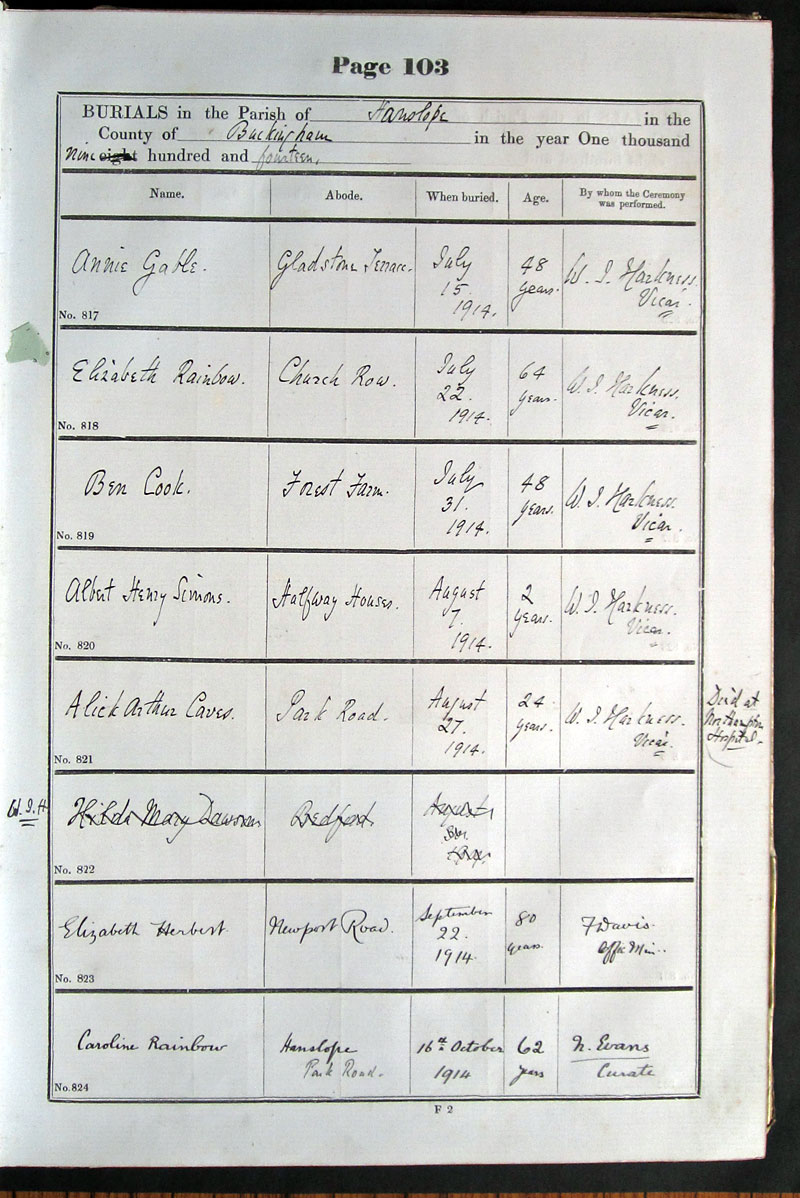 Below is a transcription and image of page 103 of the Burial register for 1878-1963 of St. James The Great, Hanslope |