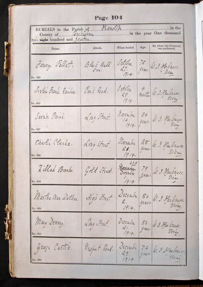 Below is a transcription and image of page 104 of the Burial register for 1878-1963 of St. James The Great, Hanslope |