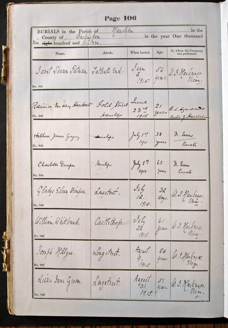 Below is a transcription and image of page 106 of the Burial register for 1878-1963 of St. James The Great, Hanslope |