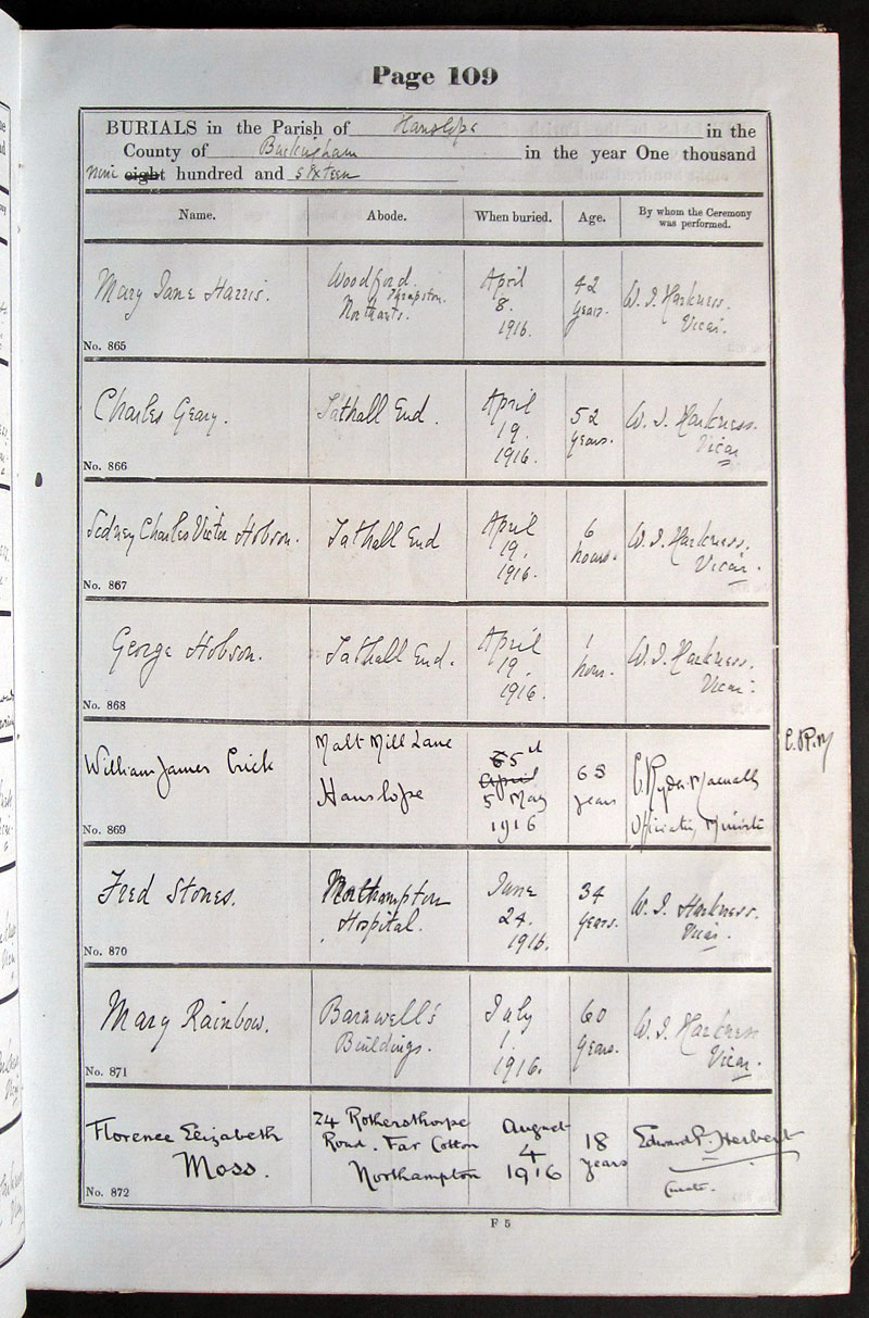 Below is a transcription and image of page 109 of the Burial register for 1878-1963 of St. James The Great, Hanslope |