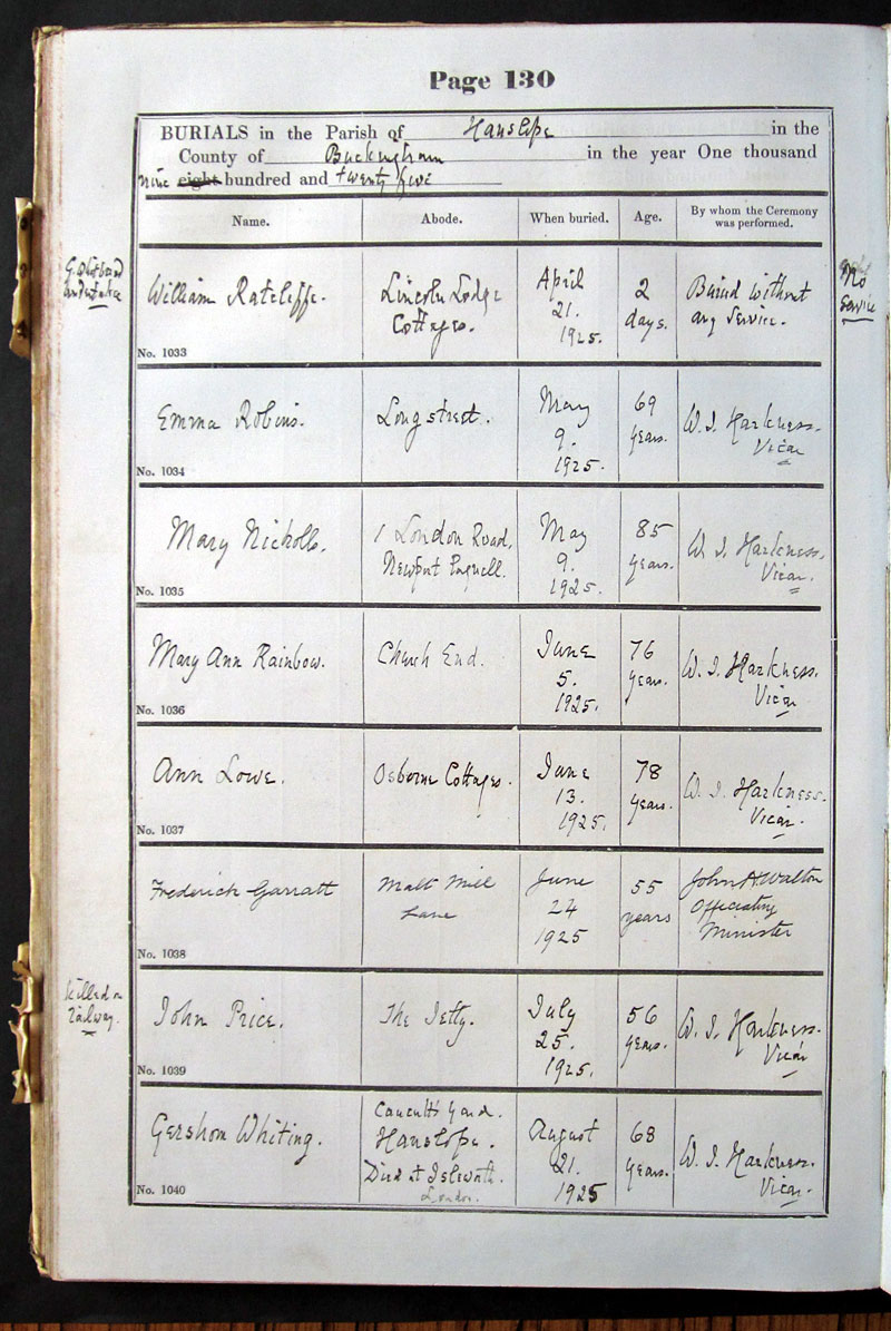 Below is a transcription and image of page 130 of the Burial register for 1878-1963 of St. James The Great, Hanslope |