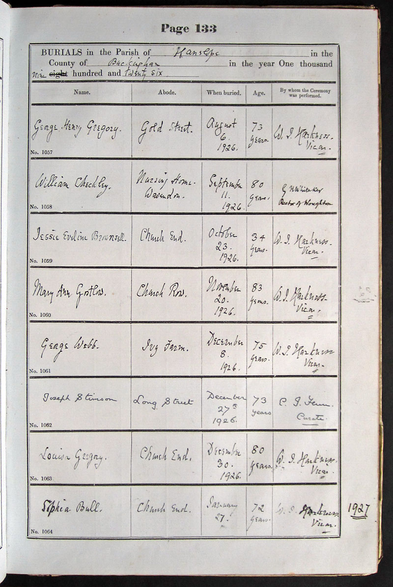 Below is a transcription and image of page 133 of the Burial register for 1878-1963 of St. James The Great, Hanslope |