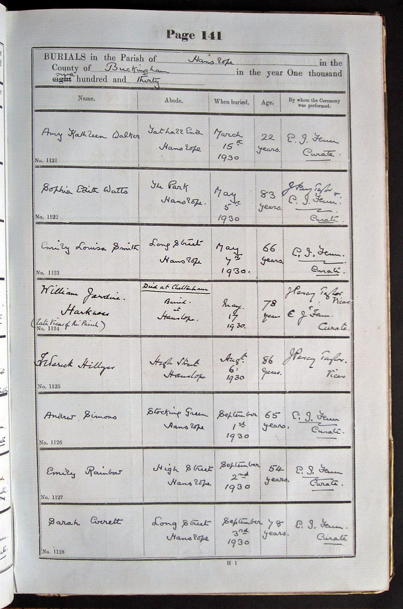 Below is a transcription and image of page 141 of the Burial register for 1878-1963 of St. James The Great, Hanslope |