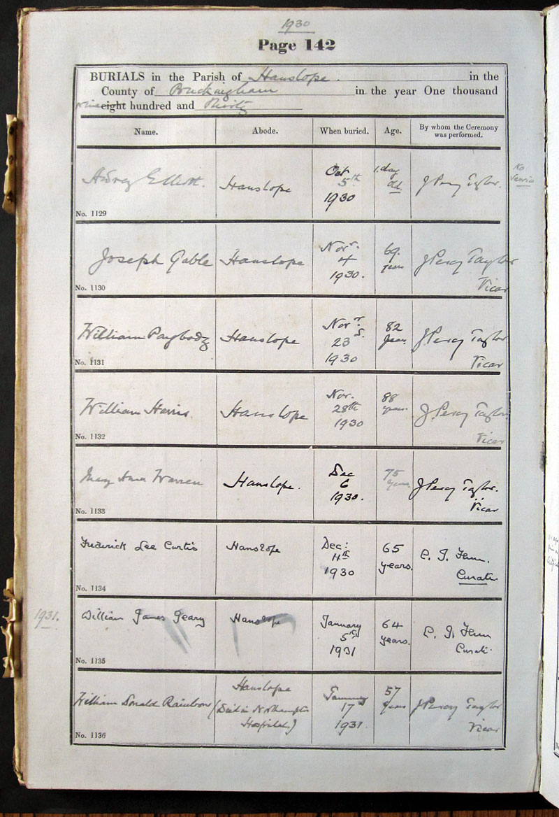 Below is a transcription and image of page 142 of the Burial register for 1878-1963 of St. James The Great, Hanslope |