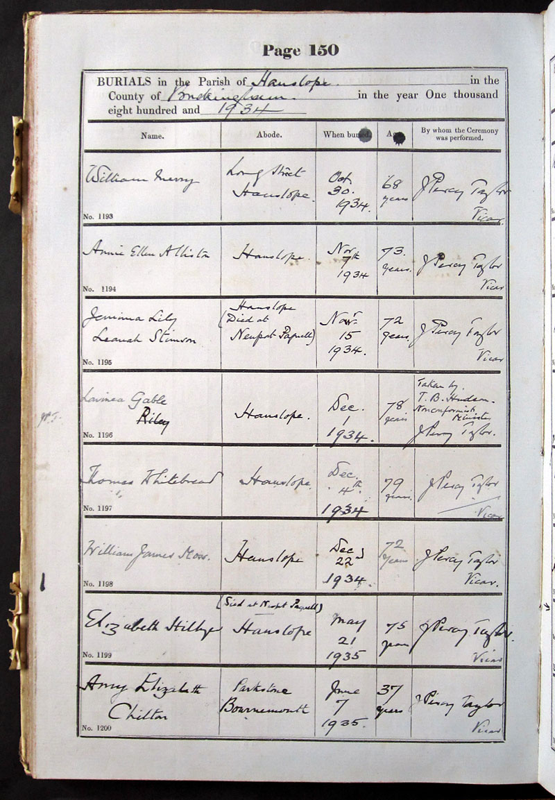Below is a transcription and image of page 150 of the Burial register for 1878-1963 of St. James The Great, Hanslope |