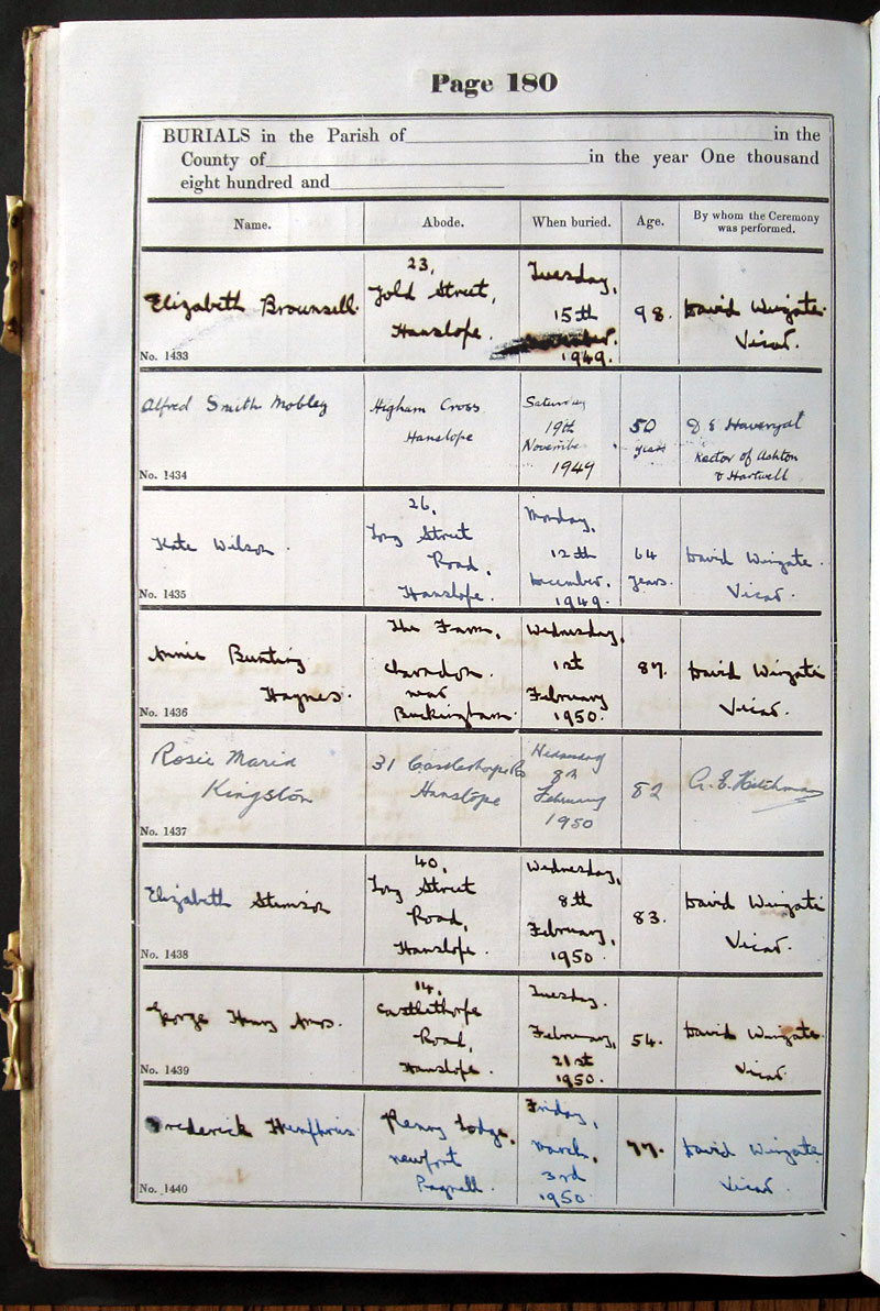 Below is a transcription and image of page 180 of the Burial register for 1878-1963 of St. James The Great, Hanslope