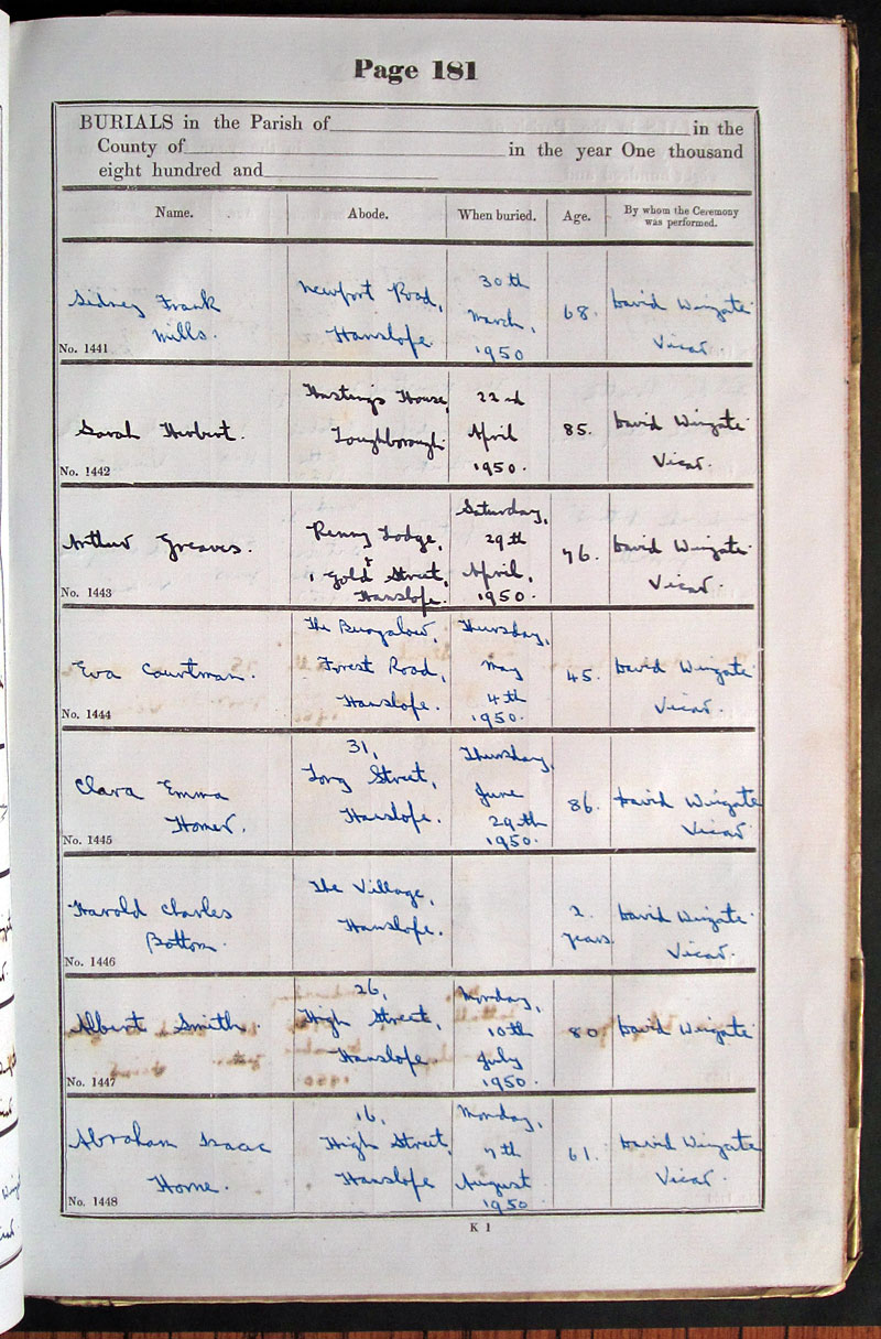 Below is a transcription and image of page 181 of the Burial register for 1878-1963 of St. James The Great, Hanslope