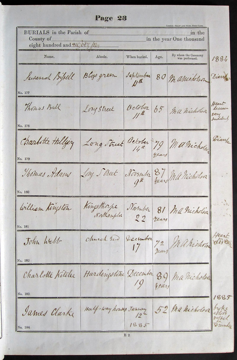 Below is a transcription and image of page 23 of the Burial register for 1878-1963 of St. James The Great, Hanslope