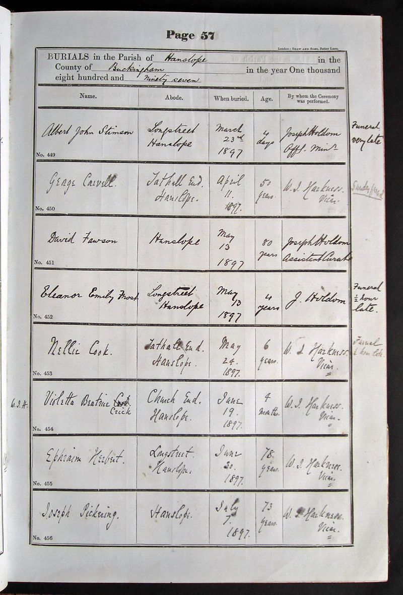 Below is a transcription and image of page 57 of the Burial register for 1878-1963 of St. James The Great, Hanslope |