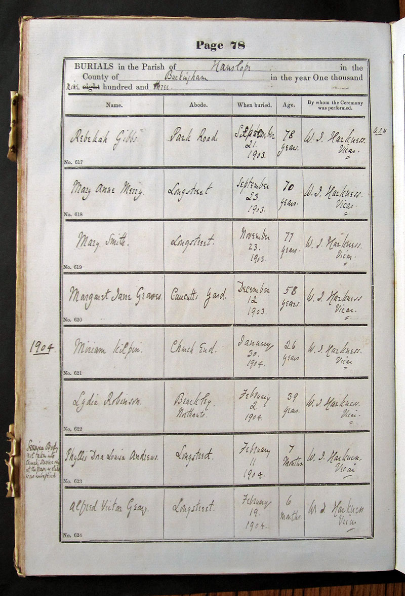 Below is a transcription and image of page 78 of the Burial register for 1878-1963 of St. James The Great, Hanslope |