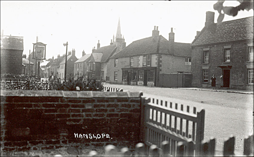 Looking from The Cock across the road,to the New Inn,the butchers shop,and Hanslope Stores.