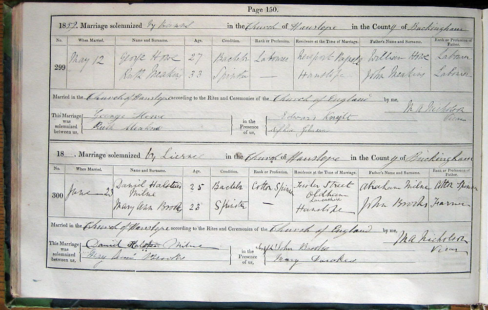 Married in Church of Hanslope according to the Rites and Ceremonies of the Church of England by me,