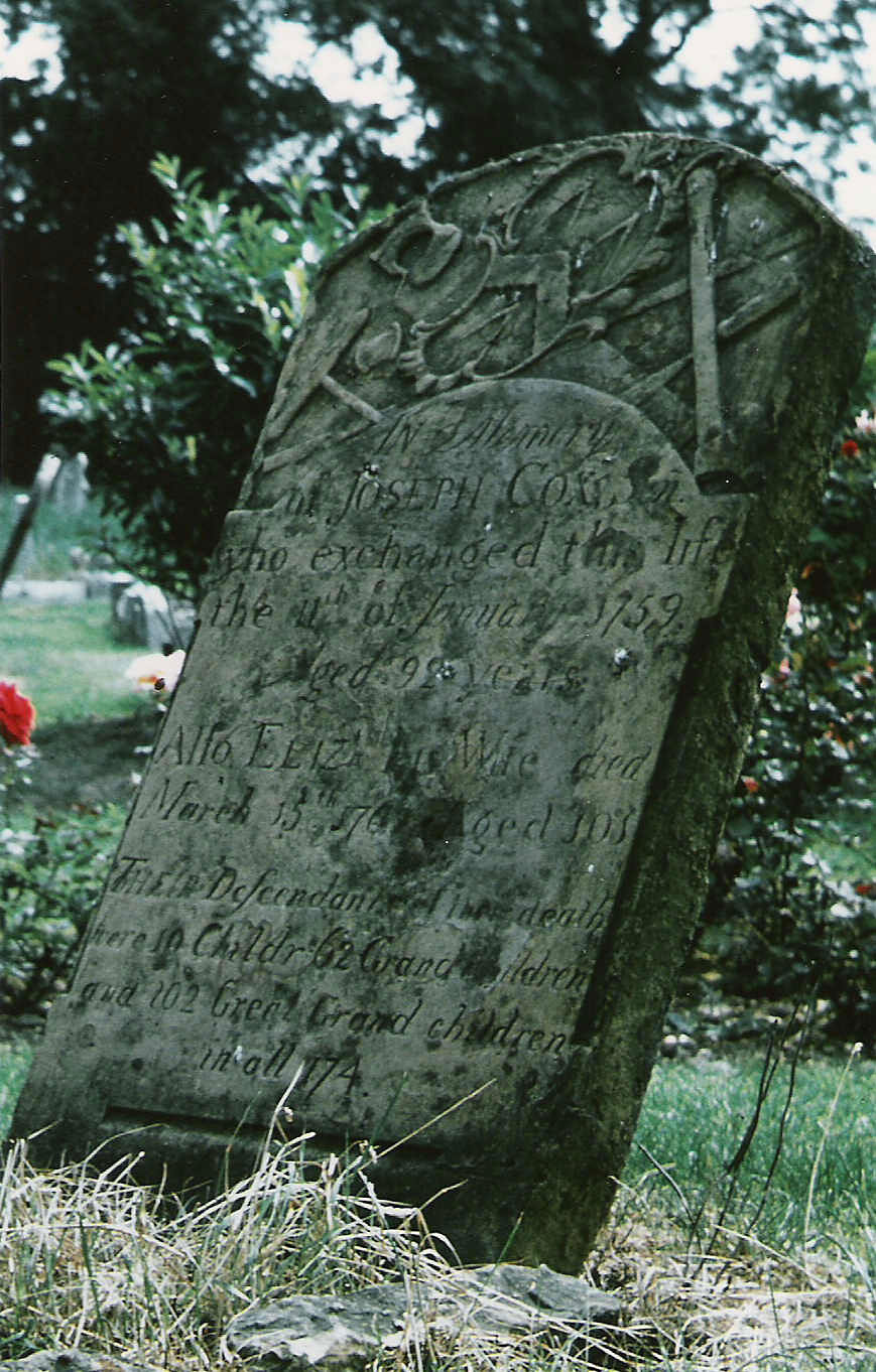 In Memory of Joseph Cox, Sen. who exchanged this life the 11th of January 1759 Aged 92 years Also Eliza. his Wife died March 15th 1762 Aged 101 Their Descendants at her death were 10 childr. 62 Grand Children and 102 Great Grand Children in all 174 |