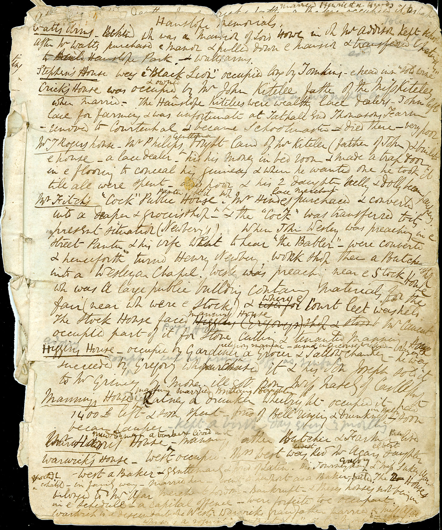 WARWICK'S HOUSE - West occupier, Mrs West was Rev M Agars eldest daughter. West a Baker, gentlemanly and fond of Latin. His journeyman Gregory and Miss Sukey Agar cohabit - in family way - married her - went to Newport as a baker - failed. The houses belonged to Mr Agar merchant, London, - Bankrupt - and these houses not being in the Schedule - a capital offence - were forfeit to occupant. Warwick is a dependant of the Wests. Warwick's grandfather married a Miss Agar who was a roguish Butcher |